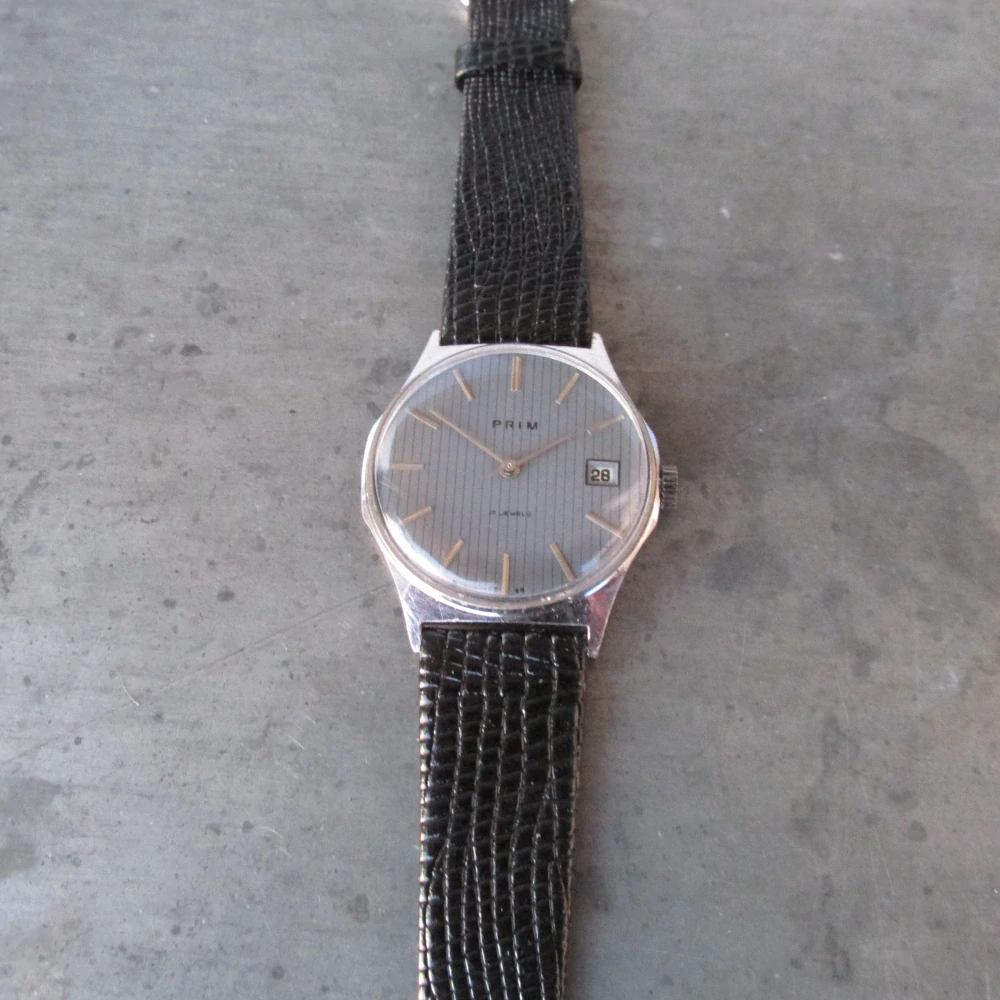 Elegantní mechanické náramkové retro hodinky Prim "PYŽAMO" s datumem, made in Czechoslovakia.
