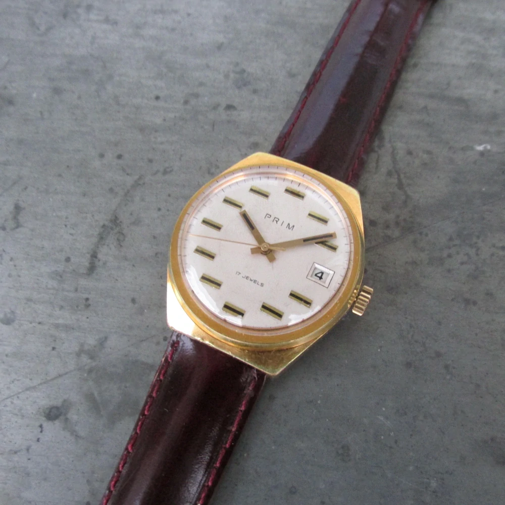 - Hodinky PRIM ve zlaceném pouzdře z roku 1974 s datumem